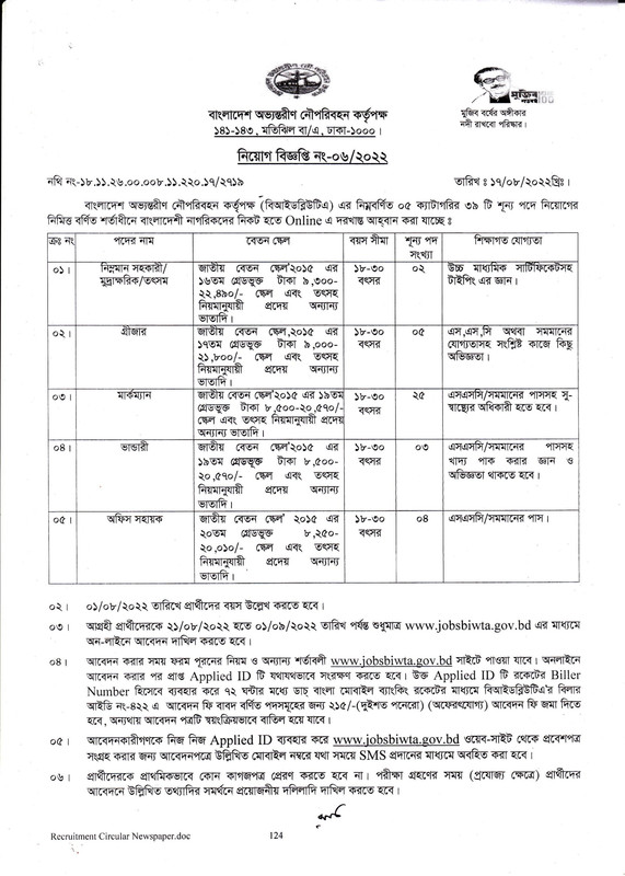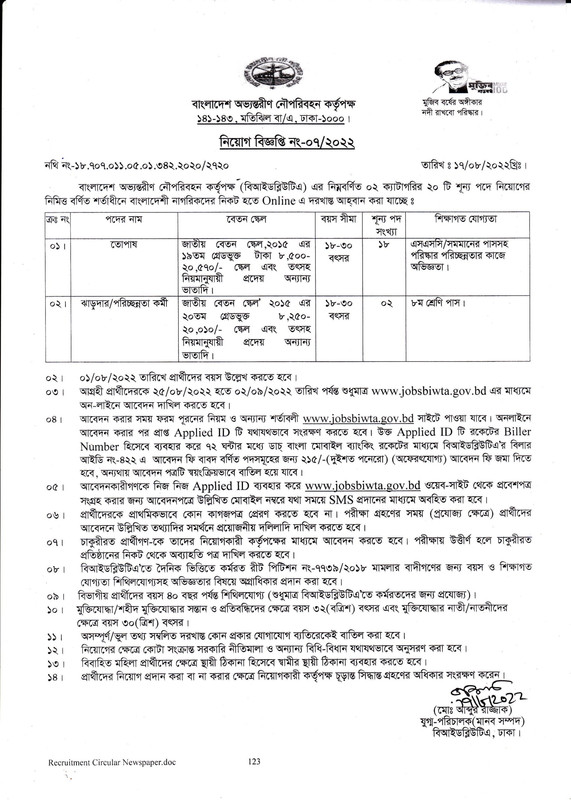 অভ্যন্তরীণ নৌ-পরিবহন কর্তৃপক্ষ নিয়োগ বিজ্ঞপ্তি BIWTA Job Circular 2022