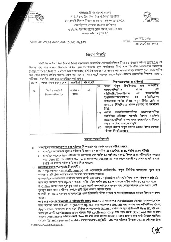 শিক্ষাগত যোগ্যতা: কম্পিউটার সায়েন্স/কম্পিউটার সায়েন্স এন্ড ইঞ্জিনিয়ারিং/আইসিটি সংশ্লিষ্ট বিষয়ে স্নাতক সম্মান বা সমমানের ডিগ্রি।